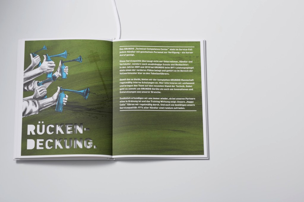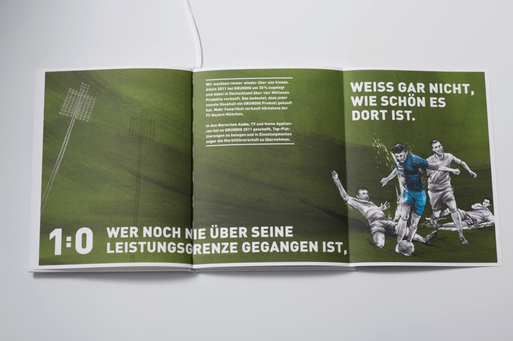 Grundig bat uns, eine hochwertige Image-Broschüre zu entwickeln. Ziel war es, die neue strategische Positionierung der Marke zu kommunizieren: Offizieller Technik-Partner der Fußball-Bundesliga.